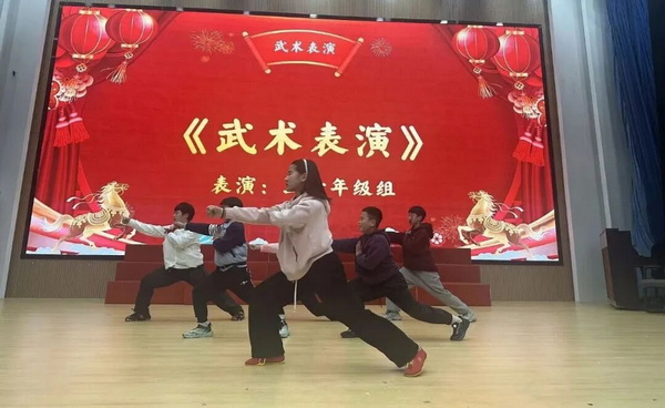 竖笛的清亮、古筝的悠扬与合唱的纯净交织在一起,奏响一曲治愈人心的乐章;压轴登场的武术操动作整齐、气势如虹,“哈!”声震天,尽显少年英气。