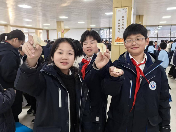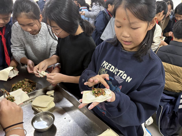 洗净双手围桌而坐,小小的身影忙碌起来:熟练的同学捏出“金元宝”,新手的馅料却总爱“偷偷溜走”,惹得大家笑作一团。